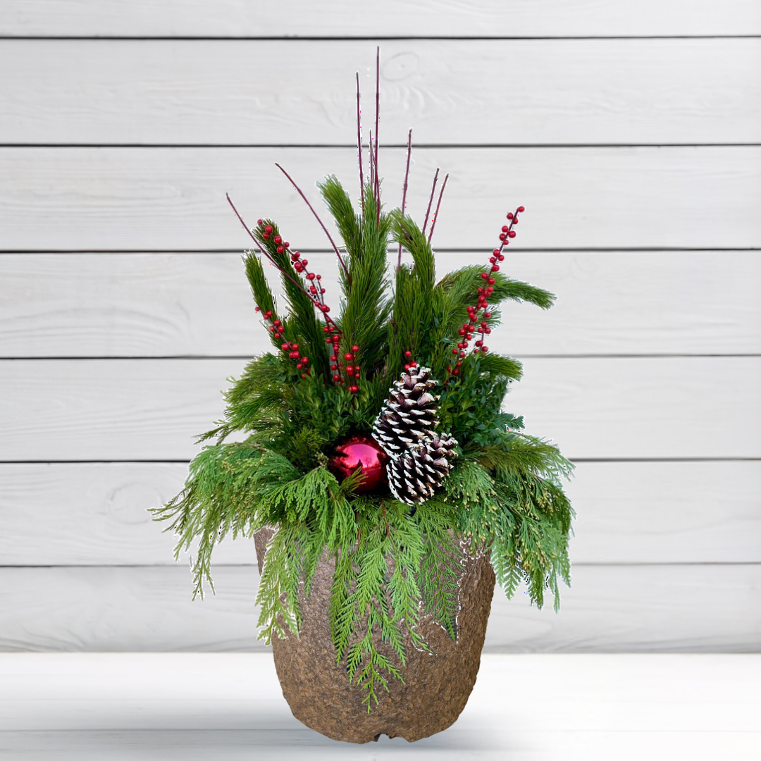 The Merry and Bright collection offers lush wintergreens, red accents, and white-tipped pinecones. A perfect holiday touch for your front porch! The Blooms Insert option includes a biodegradable fiber insert that's intended to be placed into your planter.
