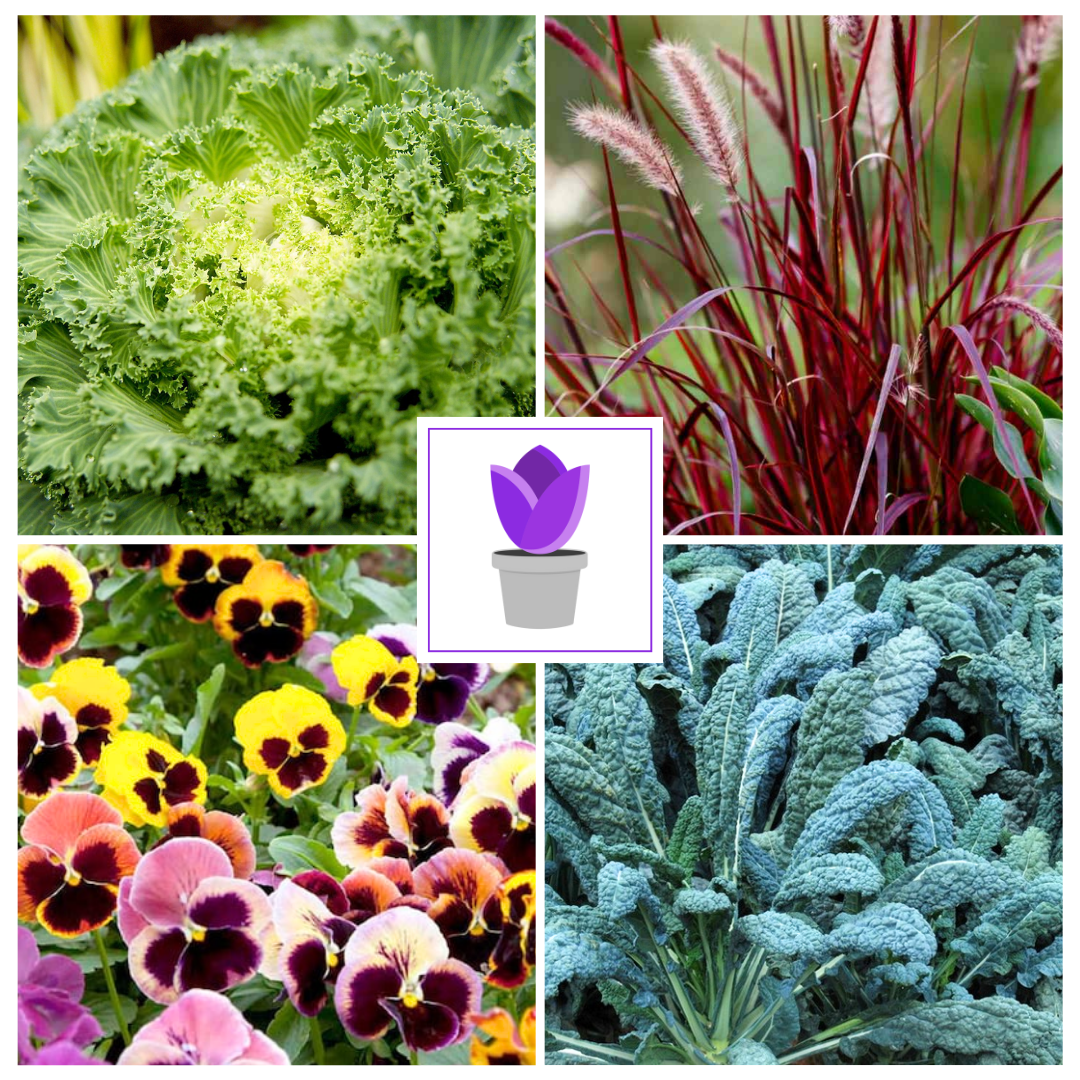 The Autumn Skies collection offers annual grass, charming pansies, and an assortment of ornamental cabbage and greens. Each collection has a "thriller, filler, and spiller" to create the perfect planter arrangement! The Blooms + Planter option includes a lightweight planter.